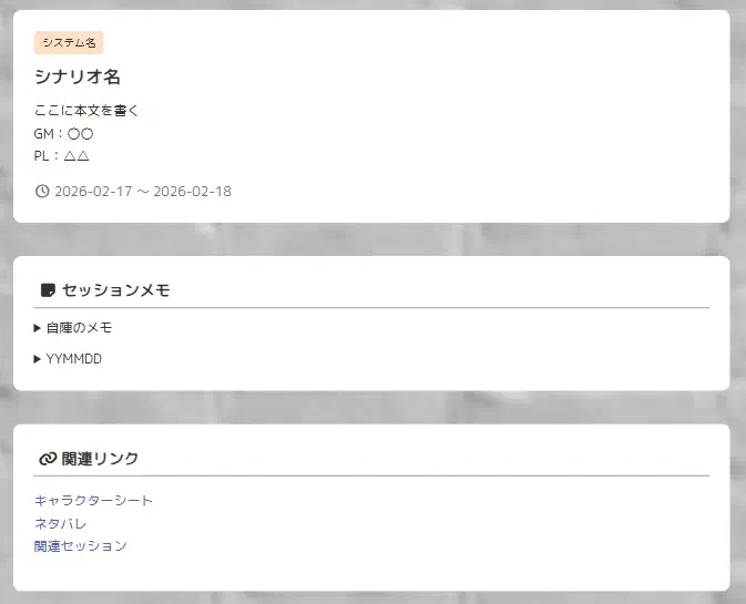 システム、シナリオタイトル、日付の他、自由に記述できるメモ欄、リンク一覧、イラストなどをギャラリーとして表示できるセクションなどがあります。